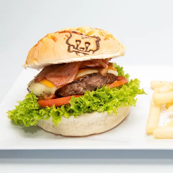 pan brioche ,120 grs de carne , jamón ahumado, papá chips, salsa de la casa y vegetales más papitas a la francesa