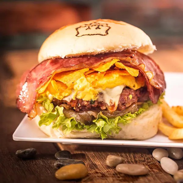 Pan de la casa tipo brioche. 150 gr de carne de res, picadillo de pollo y tocineta bañado en salsa de la casa, salsa de queso cheddar, doritos, queso mozzarella, cebolla caramelizada y mix de lechugas.
